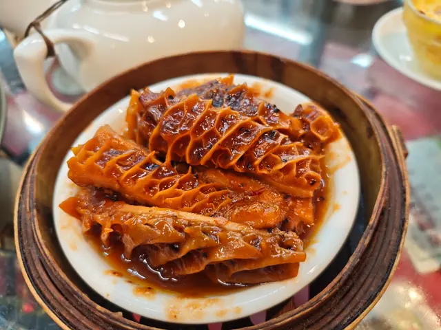 我們在餐廳點了許多精美的點心。首先上桌的是火龍果帶子餃,這道餃子色彩鮮豔,餃皮薄透,不僅外觀吸引,內餡的帶子鮮美可口,搭配火龍果的清新口感,讓人一試成主顧。接著是富貴金錢肚,這道菜色香味俱全,金錢肚的口感脆嫩,調味適中,非常美味。