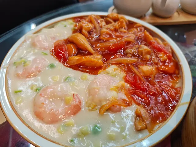 除了點心,我們還點了主食太極鴛鴦炒飯。這道炒飯金黃誘人,米粒分明,搭配的蝦仁和雞絲讓整道飯色香味俱全,左半邊是濃郁的白汁蝦仁,右半邊則是略帶酸甜的茄汁雞絲,兩者的搭配非常和諧,讓人不禁多吃了幾口。