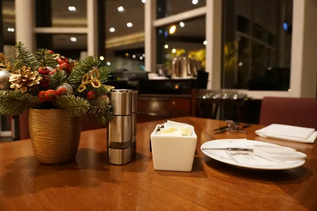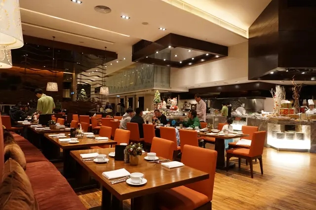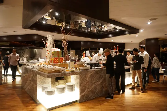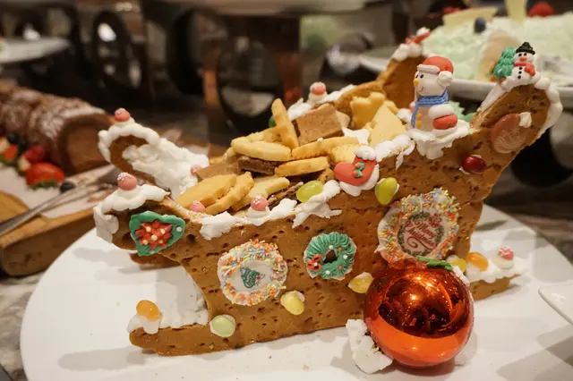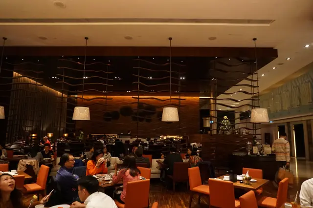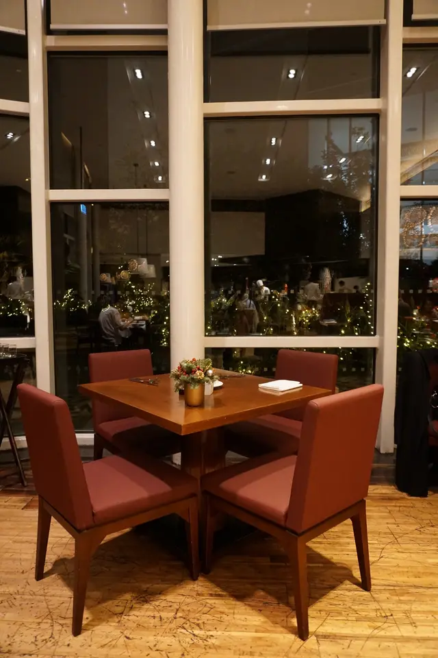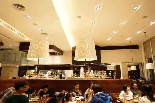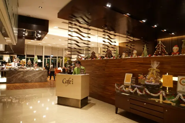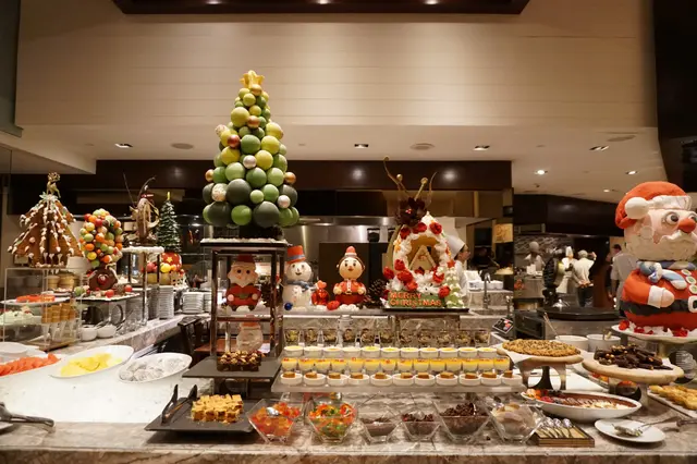 沙田HYATT大堂有棵高高的聖誕樹,咖啡廳亦佈置得很有聖誕氣氛,自助餐桌放滿了聖誕朱古力人偶和薑餅蛋糕小屋,客人的食桌上也放置了聖誕裝飾。餐廳有着特高樓底, 食桌之間空間感十足,加上落地窗外的園林景緻,用餐環境高雅舒適。
