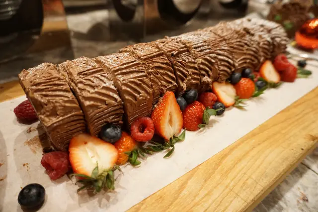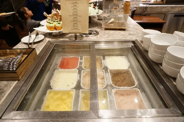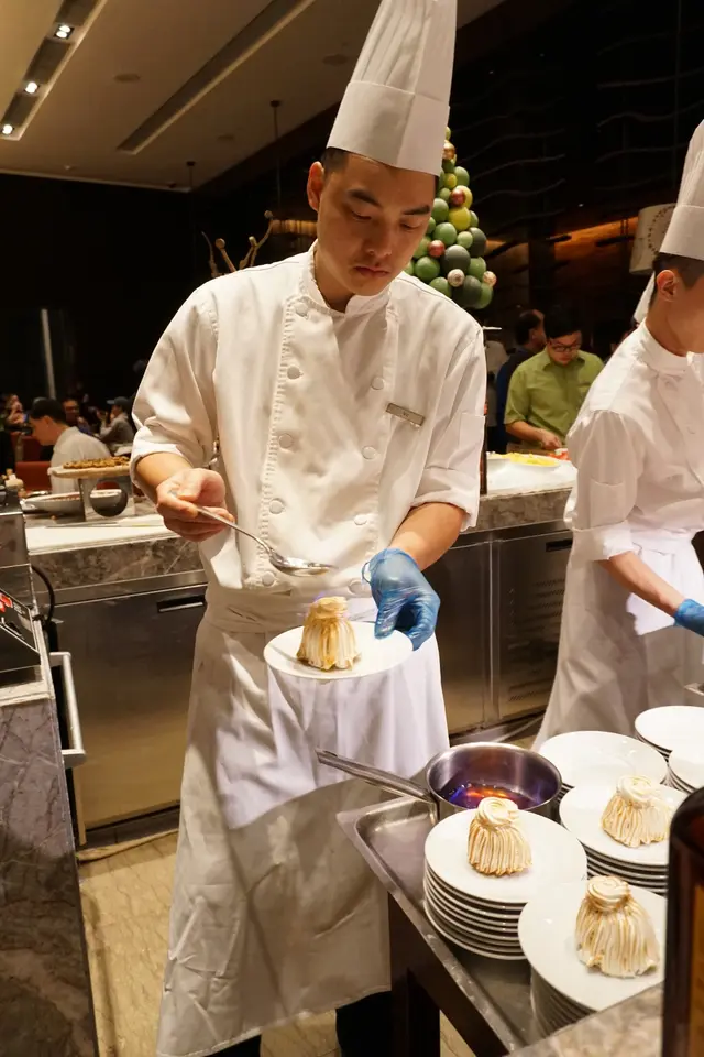 鄰桌的一家看到我的火焰雪山如此吸引,因遲了一步而吃不上。其實甜品廚房有不少聖誕甜品,如聖誕圈、木頭蛋糕、聖誕薑餅、聖誕樹杯子蛋糕等。特別推介即製雪糕班戟,一大球Häagen-Dazs雪糕裹進Crepes裏很吸引。 還有巧克力噴泉、中式甜品和沙田HYATT名物蜂蜜芝士蛋糕,定能滿足甜胃的需要。