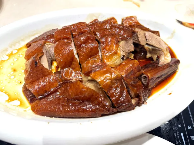 燒鵝 (半隻), 份量足, 味香四溢. 備有秘制燒鵝酸梅醬. 燒鵝肉質稔香, 鵝皮脆脆, 鵝肉厚而不肥, 少脂肪, 點些酸梅醬很滋味, 送飯一流.
