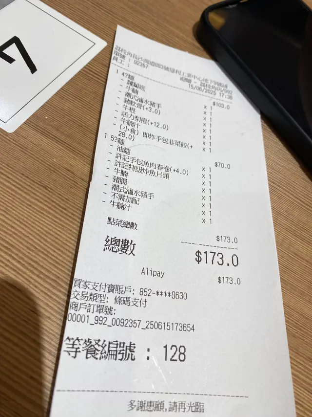 早排電視節目推介這車仔麵,過幾天專程去試。門口兩部點餐機點食物,問在旁的職員腩汁可否另上,他說會通知廚房,找了坐位坐下等了20分鐘,職員通知我豬手沒有返貨,我便改了魚蛋,再等多幾分鐘,兩碗車仔麵都完成,但在取餐時,職員說兩碗所點的牛腩也沒有,我們便改了韭菜湯餃兩份共四粒,但職員只給了三粒,叫我們先吃,另一粒煮熟後再給我……待所有食物吃光,韭菜餃還沒到,追問職員,他說韭菜餃也沒有了,你們要不要其他食物?吓?錢我又比咗,你們沒有又不跟我說,在點餐時,我們要求腩汁另上,但取餐時發覺腩汁已經放進湯裏。 職員的態度很有問題,老實講,食物和湯跟節目所推介的相差很遠,價錢也不是平,絕對不會入
