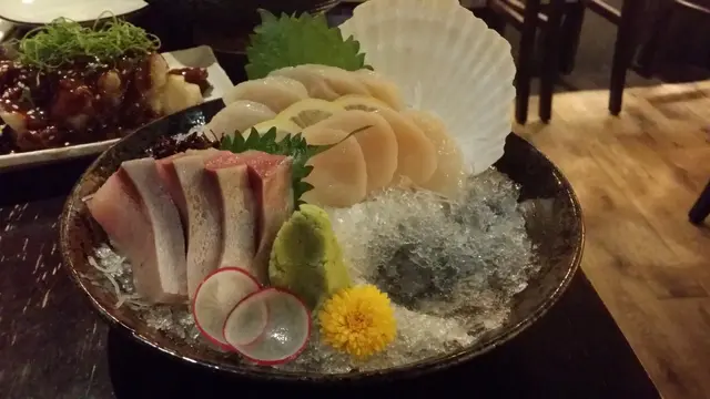 Salmon sashimi, scallop sashimi, hamachi sashimi