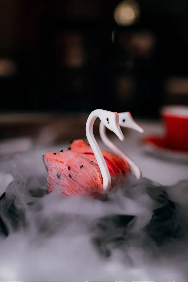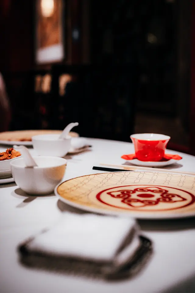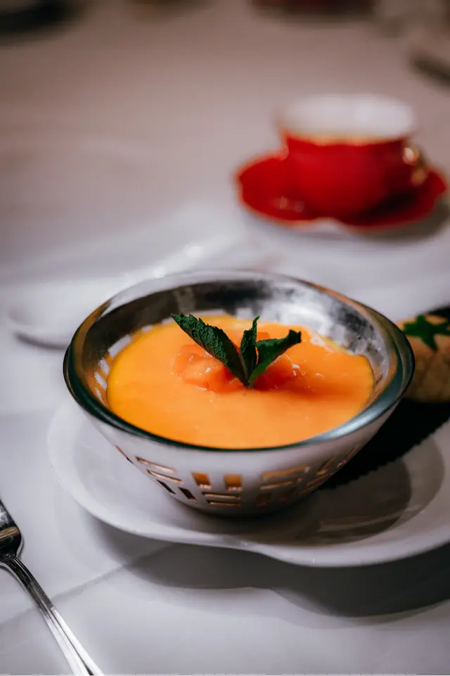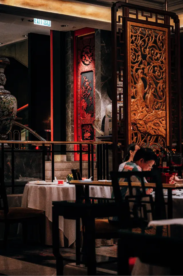 餐廳以紅色及金色仿宋雕刻裝飾,酒店裝修豪華典雅。主廚梁燊龍師傅擁有超過40年粵菜經驗,曾於香港及德國研習,擅長融合傳統與創新。梁師傅透過細膩手法以及精選時令食材,重塑經典粵菜,多年來帶領「香宮」屢獲米芝蓮殊榮。菜式既有傳統味道,又帶點新意。
