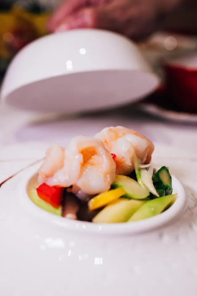 之後來的翡翠鮮黑皮雞配㙡菌油泡蝦球。蝦球超彈牙,油泡的手法讓海鮮的鮮味特別突出。