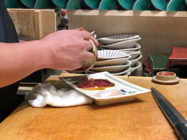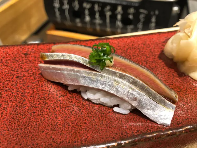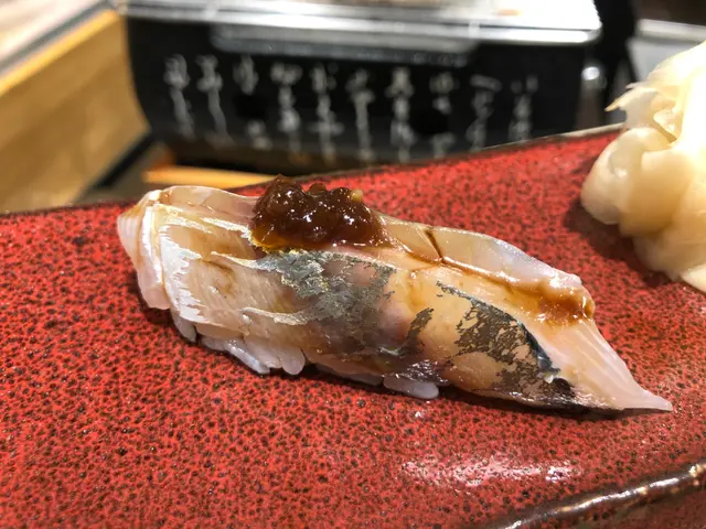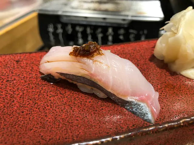 師傅為我準備的第一貫壽司是右口魚,是味道較淡雅的白身魚之一,只有簡單的碎蔥伴隨著,入口清新,魚肉細嫩。