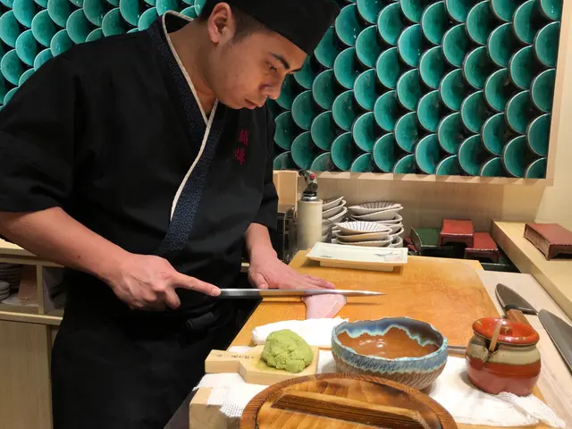 接下來,來到較重味的秋刀魚,由牠的淺紅色魚肉,代表牠的味道會較白身魚為濃味,所以師傅用了較濃味的調味——「薑蔥」,薑蔥除了可以辟走腥味,還有提鮮的作用,跟秋刀魚搭配很適合。
