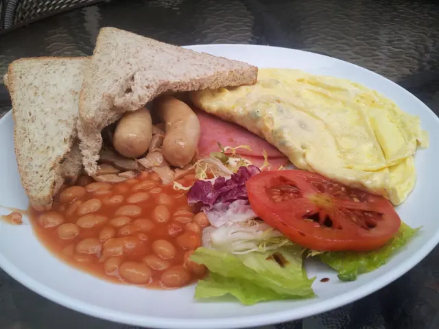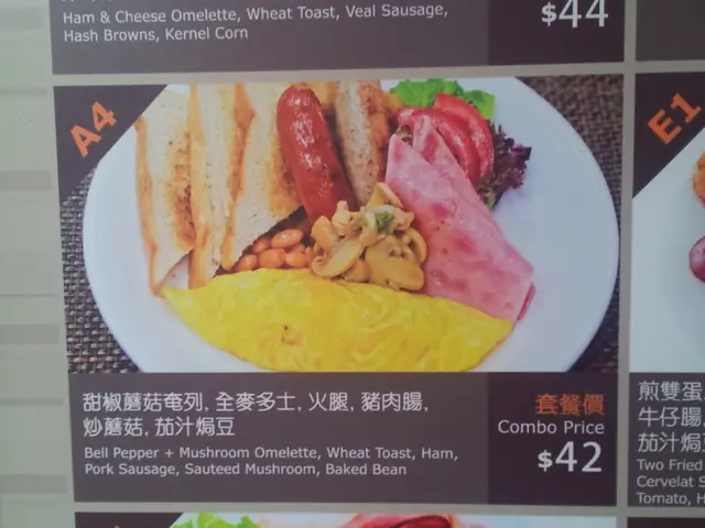 這天選的早餐是 A4,材料包括三件三角全麥多士,一份大大的甜椒磨菇奄列、兩塊火腿、兩條豬肉腸、少許炒磨菇、茄汁焗豆和沙律菜,把碟子舖得滿滿的