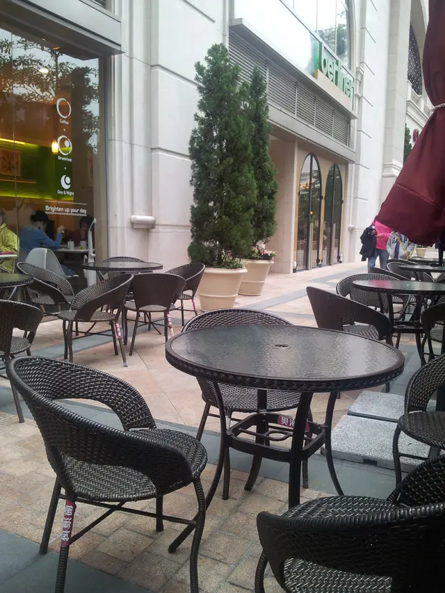 ,太陽躲在雲後歇息,更有一點涼風吹拂,清清涼涼的,坐在戶外的烏黑色織花藤椅上用餐,觀看四周被大量綠色植物圍繞,刻意營造的悠閒寫意空間,感覺挺舒服的。特別是這天沒有志明與春嬌在此吞雲吐霧吃早餐,感覺就更好了