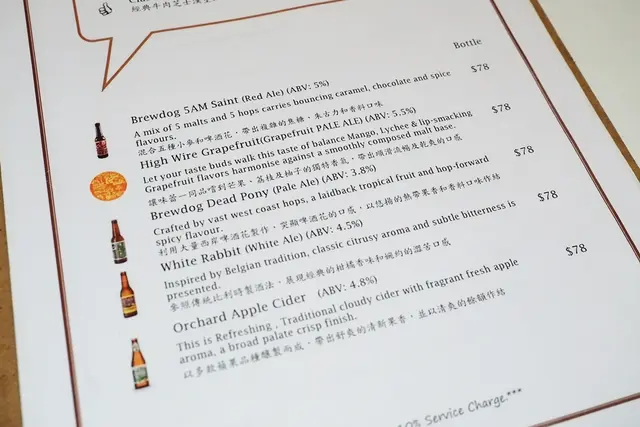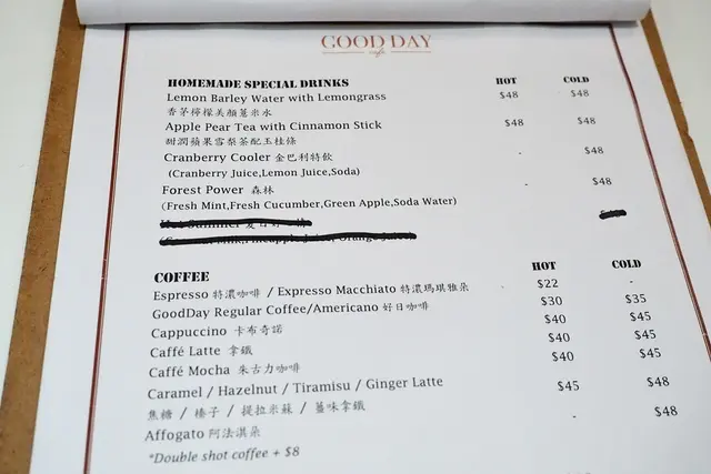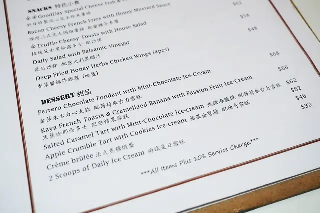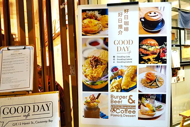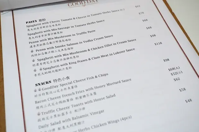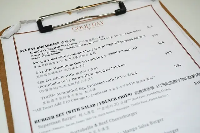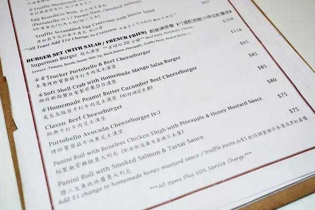 餐牌上有供應全日早餐、小食、意粉、漢堡(可選要跟薯條/沙律)和甜品。