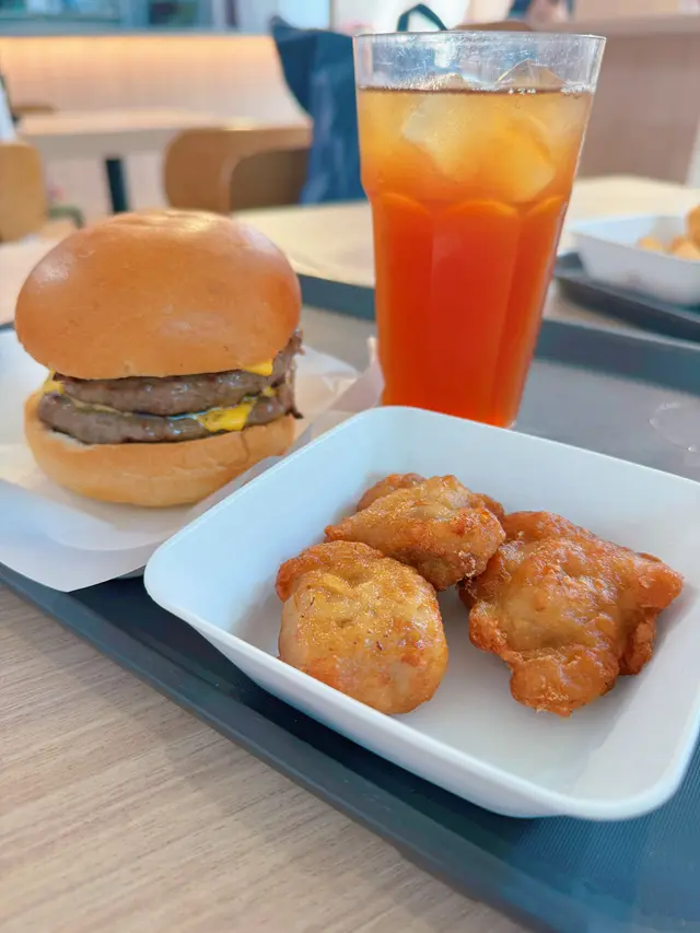 呢個漢堡其實算係邪惡之中嘅天使,平民性價比之選,因為兩塊牛其實幾厚下,出面其他餐廳食的話我覺得至少都要$88,慶幸芝士冇想像中咁多,所以一啲都唔會好腬👍🏻雞球炸雞粉唔算多,配搭冰紅茶就唔會有油膩感,紅茶唔甜,偏淡,唔鍾意重口味嘅人就啱啦🤭
