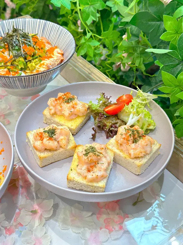 👍🏻並非傳統蝦多士,而係真係有滿滿蝦粒嘅鬆軟厚多士🦐,彈牙蝦粒撈埋蛋黃醬及明太子醬,鹹鮮香口