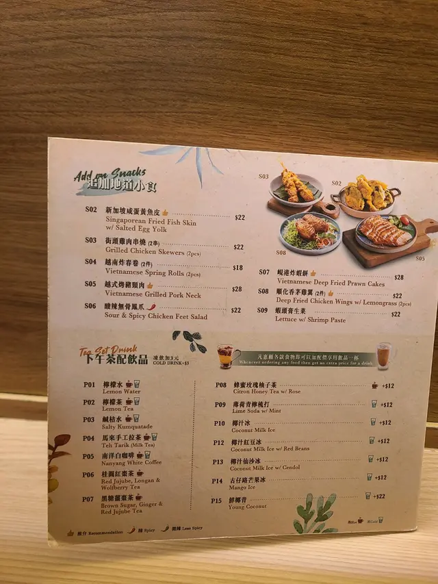 餐牌:下午茶餐有好多款選擇,有越式湯粉,娘惹風味,米飯撈檬,馬來咖哩,包飲品七選一,無加一,仲可以追加地道小食。