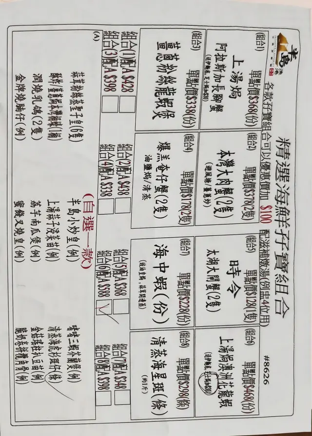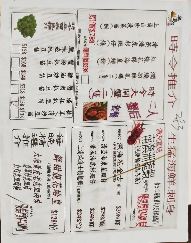 a.上湯澳洲焗花龍蝦(送伊麵底,芝士加$30)配清蒸海虎衫班仔(條)