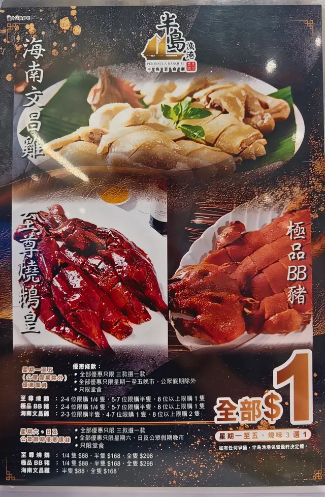 文昌雞好正,肉質嫩滑,點埋佢個醬汁好食,但切記星期一至五先係最抵食(燒味三選一(海南文昌雞,至尊燒鵝皇,極品BB豬)都只係需要$1,你無聽錯,係1蚊,六日及公眾假期會收回$88半隻至1/4隻