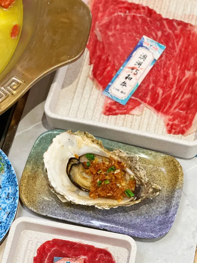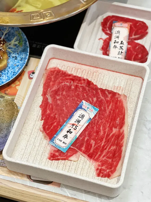 肉類方面,澳洲M5和牛油花豐富且均勻,細嫩多汁,有濃郁的牛肉風味;澳洲和牛五花趾脆嫩且富有彈性,帶有明顯的筋膜和筋肉感,還有澳洲羊肉片及美國豬梅肉等…