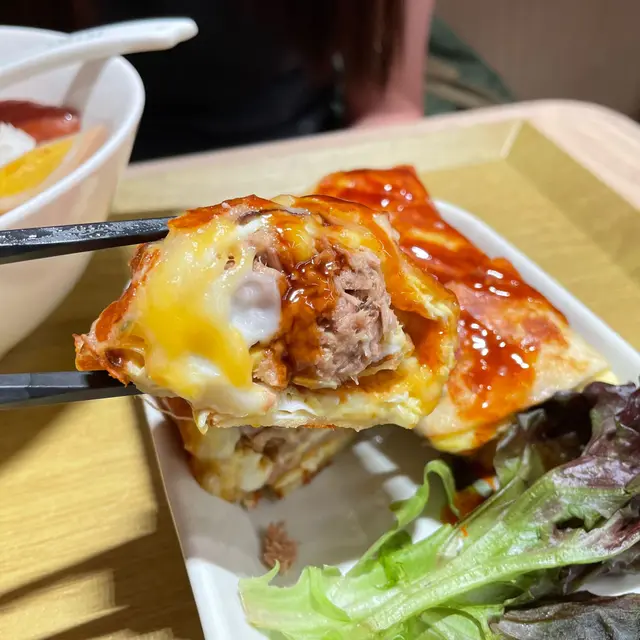 蛋餅賣相都不錯,打卡好靚。外層脆脆地,有少少既蛋香味,仲有豐富嘅芝士。個餡係鮪魚加玉米,D餡好多,爆晒出黎,食完好滿足。