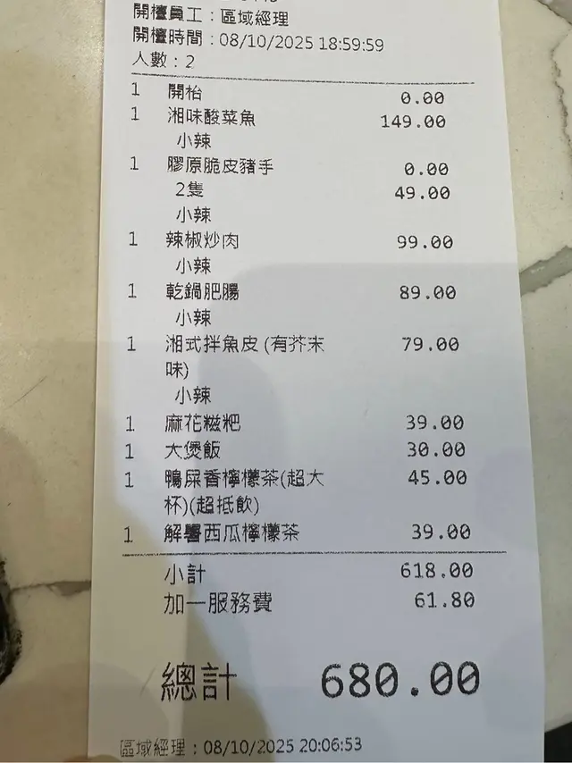 菜式份量足,味道正宗,酸辣開胃,每道菜都充滿鑊氣和湘菜的靈魂。酸菜魚和乾鍋肥腸超推,配上大煲飯簡直無敵!甜品麻花糍粑香脆可口,飲品清新解膩,完美平衡整個用餐體驗。餐廳環境舒適,服務親切,性價比高,絕對是荃灣食湘菜必到之處!