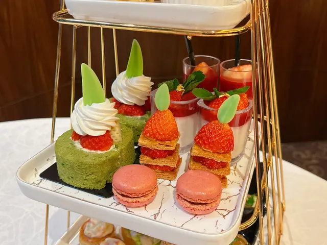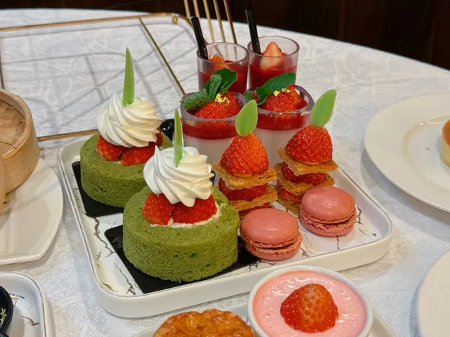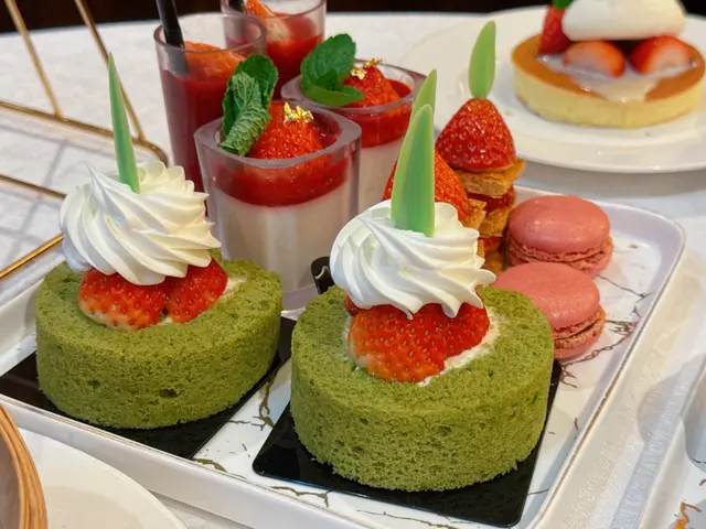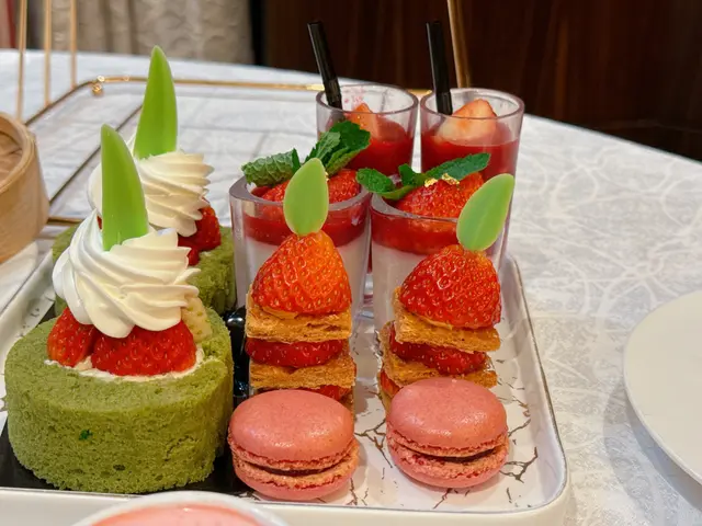 野草莓凍湯|自家製士多啤梨拿破崙餅|自家製士多啤梨綠茶卷|士多啤梨熱香餅|金箔草莓意大利奶凍|英式鬆餅伴草莓忌廉及果醬|精選馬卡龍