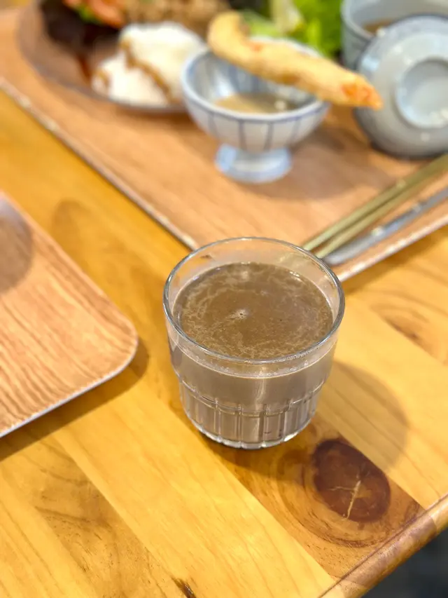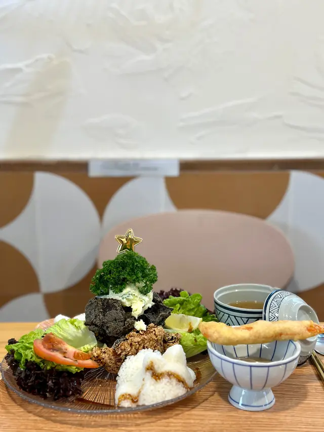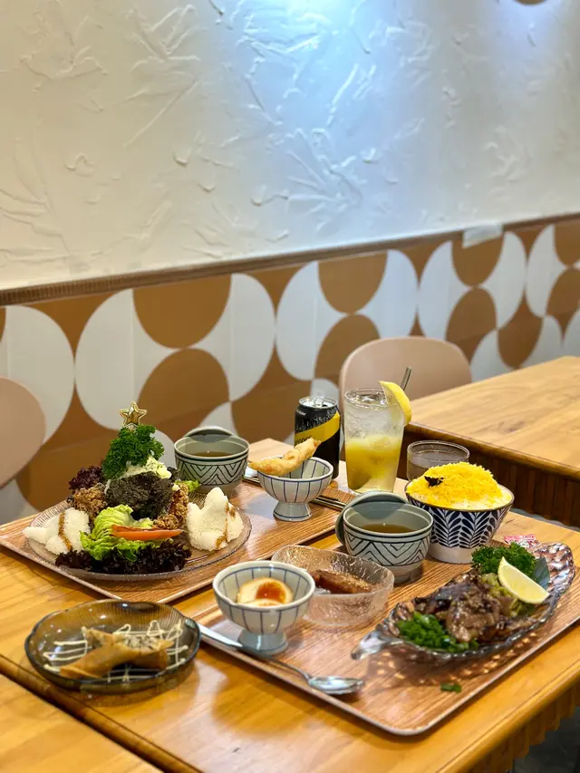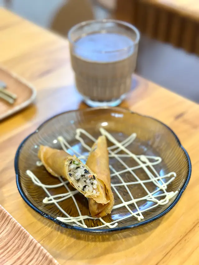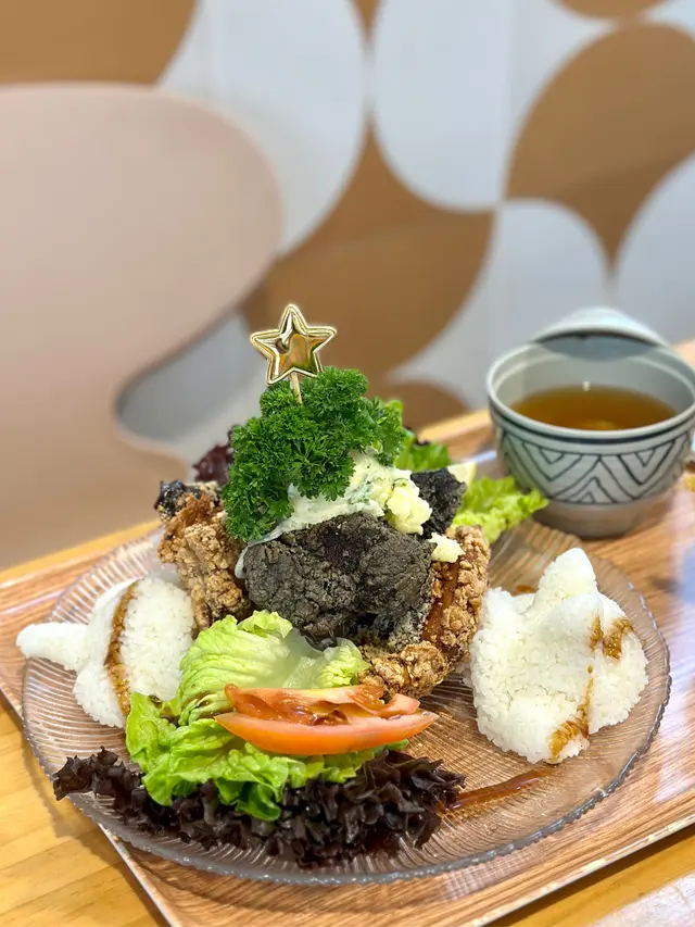 份量澎湃,有三大塊香脆多汁的黑白炸雞、蟹柳天婦羅及日式薯仔球,宛如一棵聖誕樹,加上貓貓造型的日本米飯,可愛滿分💕小食加配了自家脆炸飯卷 (+$13),口感香脆,中間是白飯加入洋蔥、紫菜與櫻花蝦。飲品選擇了清新的檸檬菠蘿汽泡水 (+$18),看到有愛玉凍(+$8)忍不住加了,很Q彈滑溜😍