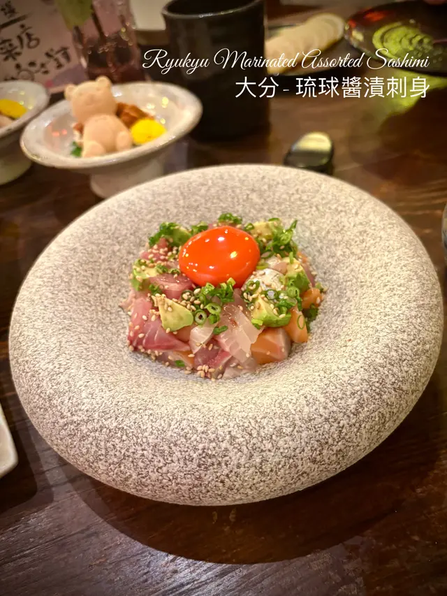 三文魚、吞拿魚配牛油果,色彩繽紛。刺身鮮甜,牛油果creamy滑溜,特製琉球醬汁帶芝麻香,完美融合。大分嘅地道夏日美食,食落超開胃!