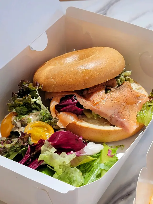 煙靭嘅Bagel麵包夾住煙三文魚、cream cheese同爽脆沙律菜,夠哂健康。