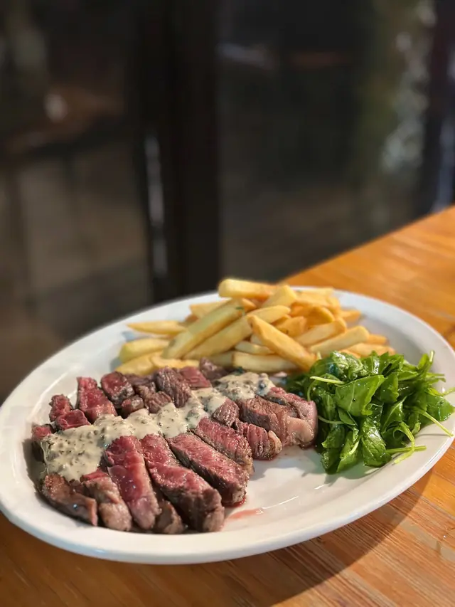 3)澳洲m3和牛肉眼扒,法式忌廉胡椒醬配脆炸薯條:第二度主菜就係澳洲和牛扒配炸薯條,剛和牛扒煎嘅時間啱啱好,肉嫩而且充滿肉汁。而且薯條係我喜愛嘅粗薯條,再配上佢哋秘制法式忌廉胡椒醬,胡椒香十分野味。