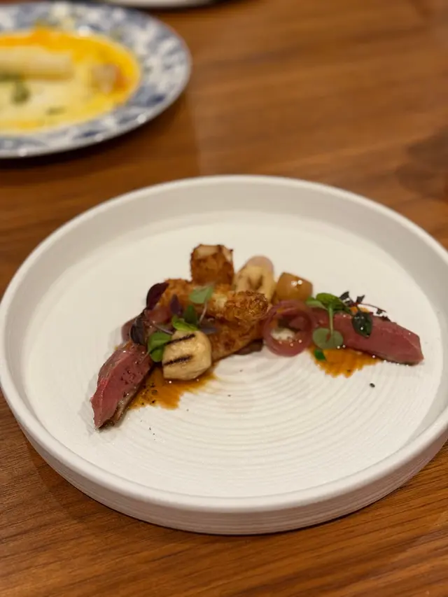 以低溫慢煮乳鴿,肉質柔嫩多汁💦搭配雙重處理嘅白蘆筍🤍香炸與清煮,形成口感對比😆醬汁以蘑菇熬製🍄🟫盤中點綴芝麻菜苗,其微辛香氣平衡乳鴿嘅豐腴👍🏻