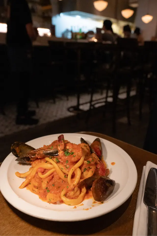 ⟡‧₊海鮮濃汁手工圓麵 : 麵條煙靭略似手打烏冬,配搭大蝦、青口、蛤蜊等,配蕃茄海鮮醬汁,酸甜開胃🍝