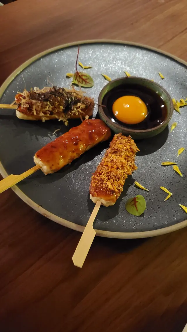 這道菜以三種不同方法炮製免治雞肉棒,做出灑滿鰹魚及紫菜絲的大阪燒;以原口味並沾上蛋黃汁食用的燒鳥月見;以及少少辣的避風塘三種口味,各有特色。而雞肉棒內亦有頗多雞軟骨碎粒,食落好有口感。