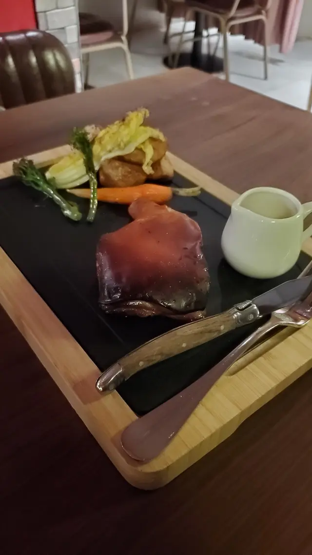1/4隻乳豬選用腿部位置,份量已夠二人食用,外皮燒得非常酥脆,切的時候肉汁勁多,入口好腍,配搭的醬汁尤其特別,既有蜂蜜芥末又有少許醋汁味道,還有薯仔粒及甘筍等配菜。
