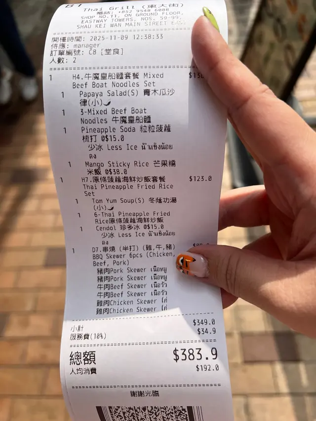 原條菠蘿有烤過,菠蘿鮮甜多汁;海鮮炒飯配料有魷魚鬚、魷魚、蝦仁、青口、菠蘿粒、肉鬆、腰果,材料非常豐富,每一口都可以吃到飯及配料。