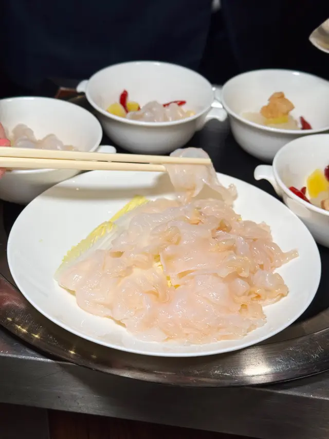 上菜時將滾燙嘅魚湯過橋灼熟肉質脆嫩嘅日本象拔蚌