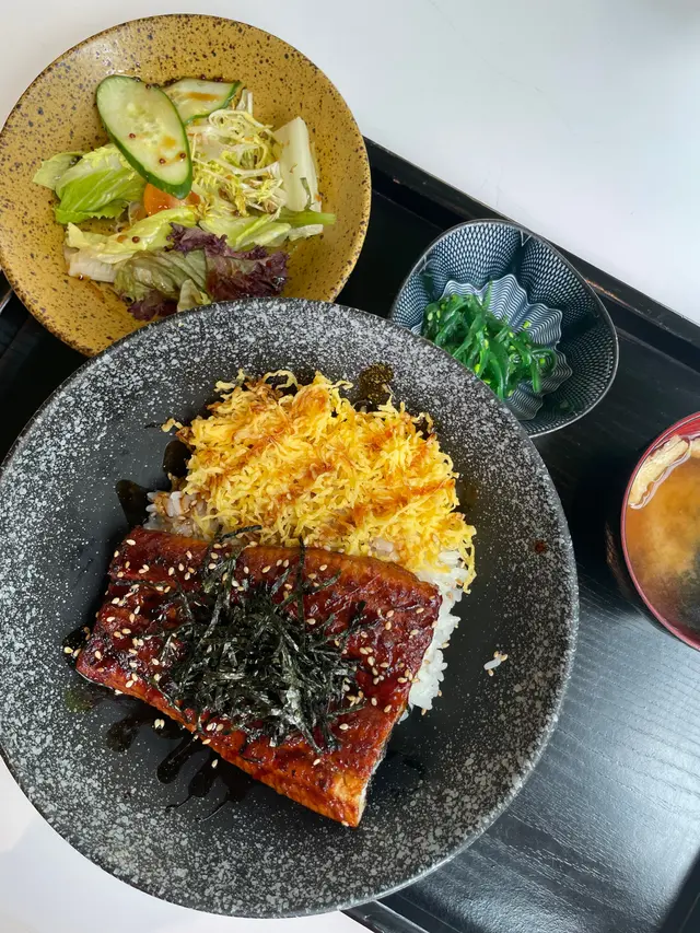 #蒲燒鰻魚定食 好豐富的日式蒲燒鰻魚定食足足有半條鰻魚,加上雞蛋絲和鰻魚汁,每一口也同樣有口感,另有中華沙津和麵豉湯配合定食,這個飽飽。