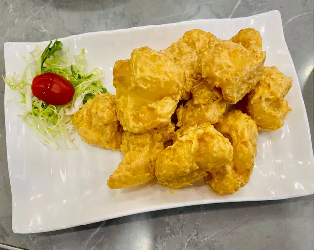 黃金蝦球,蝦肉相當大粒,沾上炸粉後放入熱油中炸脆,再以鹹蛋黃醬包覆著。重點的是每顆蝦球都平均沾滿了鹹蛋黃醬,不似部分坊間的餐廳,值得一讚。蝦球入口非常香脆,肉質彈牙,味道鹹香惹味。