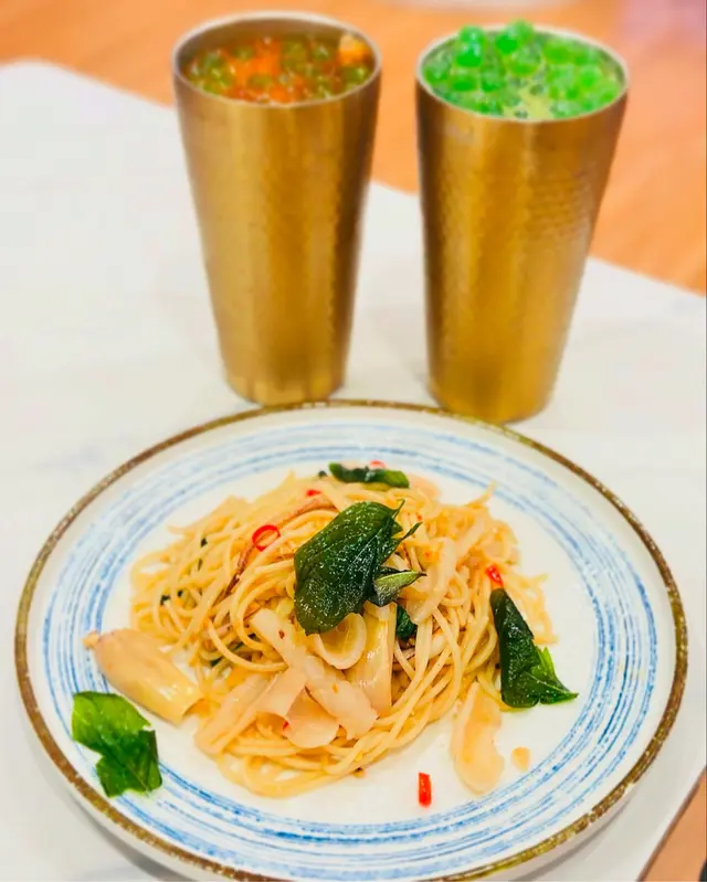 扁意粉煮至剛好保持嚼勁,混炒九層塔與打拋葉帶來濃郁香氣。魷魚圈經快炒後捲曲成花狀,口感爽脆不韌。小米辣的辛香有啲over,👷🏻♀️細孖辣傷喉嚨,但檸檬汁的微酸交織,整體風味層次分明