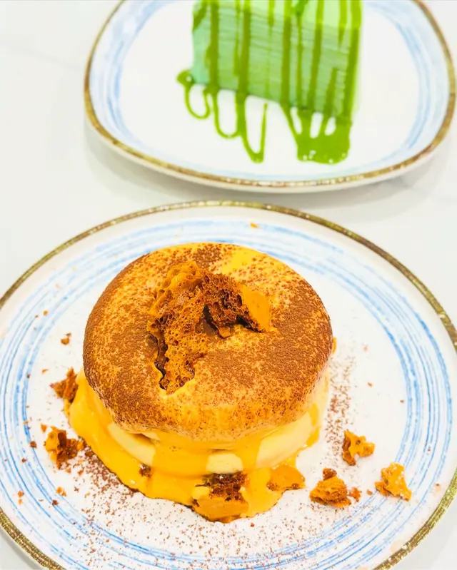 現點現做的班戟膨脹如雲朵,搖晃盤子會呈現誘人DL感。淋上以泰茶同忌廉泰式奶茶醬後,內裡氣孔細密濕潤,建議儘快享用以免塌陷,配埋焦糖脆脆會政可口