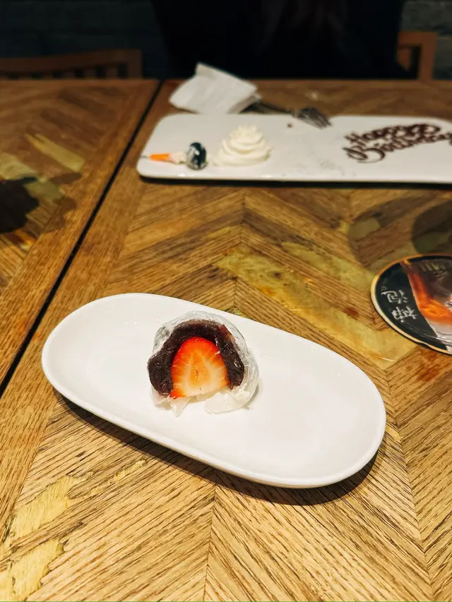 草莓大福外皮柔軟,估唔到呢度都有得食,內餡草莓酸甜,配以香甜既紅豆蓉