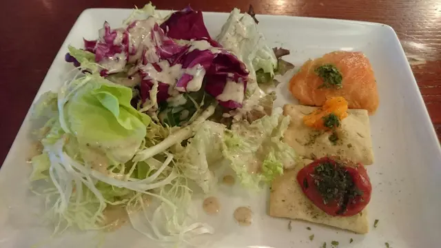 加$22沙律和小食脆餅三重奏 係蟹籽,煙三文魚,香醋小蕃茄配意大利香草餅…佢寫到咁當然好期待啦,點知黎到嚇親,咁細要比$22,果片餅得2節手指咁闊,一口食晒仲要係冇咩香草味,唯一係煙三文魚味道吾錯。