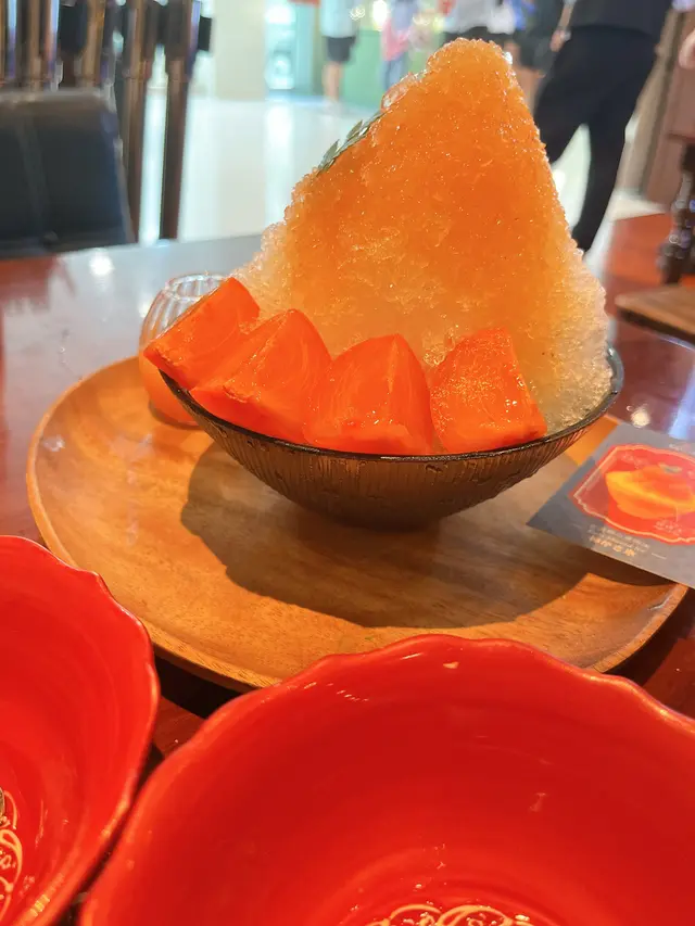 打卡一流!成座小山咁高嘅刨冰,淋上蜜漬柿子醬,有新鮮柿肉。刨冰打得極細綿,入口即化,甜度控制得剛剛好,透心涼!