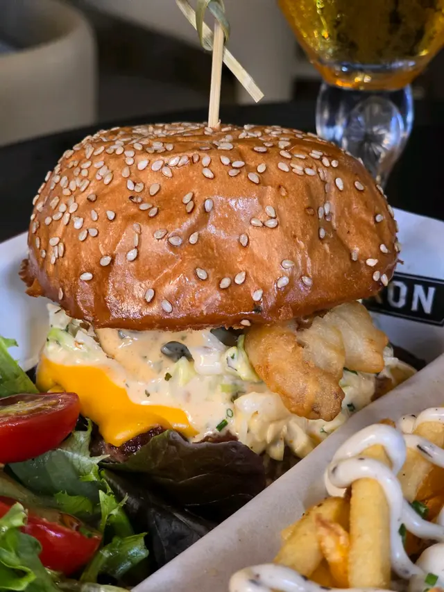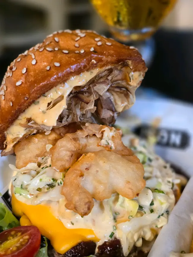 安格斯漢堡扒🐂牛味香濃,鮮嫩多汁又充滿油香,加埋香脆鮮味嘅龍蝦🦞天婦羅、爽脆椰菜絲、清甜蕃茄🍅、鹹香芝士🧀及七味香蒜醬,口感十分豐富,味道極之香濃,令人回味無窮😍。
