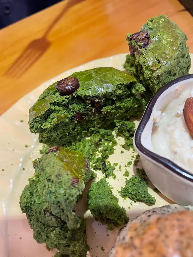 我選的是伯爵茶和宇治抹茶配朱古九粒,鬆餅外脆而入面濕潤鬆軟