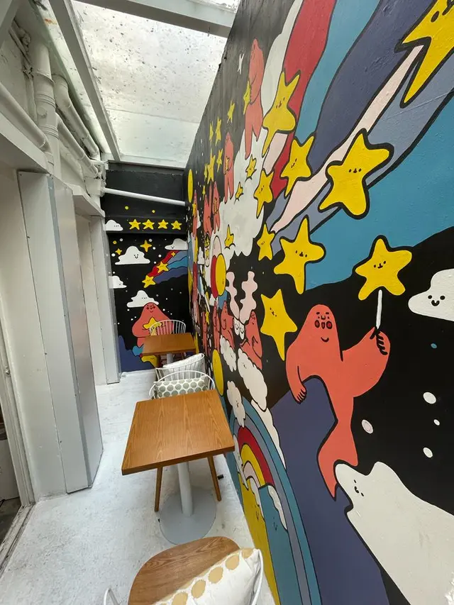 而門面全白色但室內裝修有色彩繽紛的手繪牆壁,再配色彩繽紛的食物,