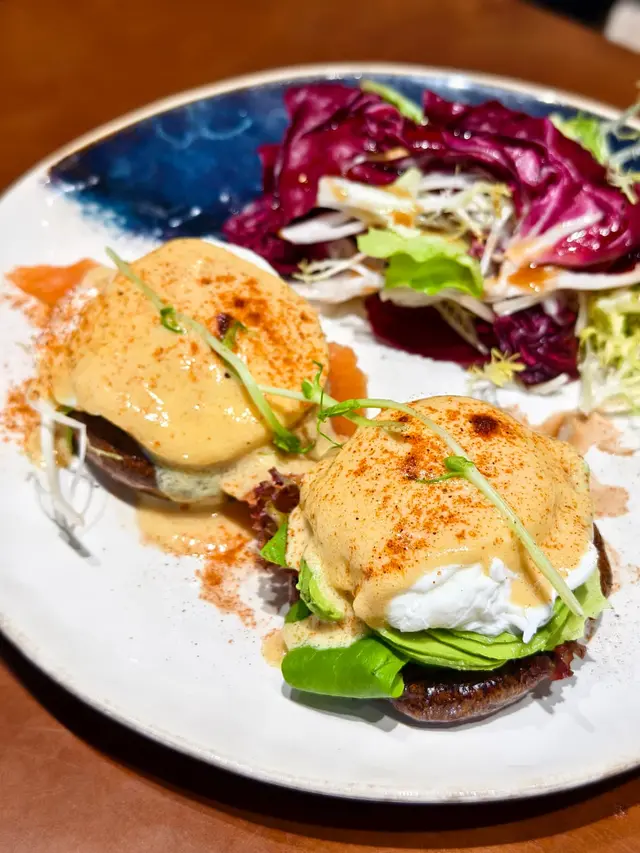 兩個大蘑菇上面各放咗三文魚同牛油果,水波蛋動L動L超治癒。篤穿蛋黃流落去,一啖食落口,真係好正!