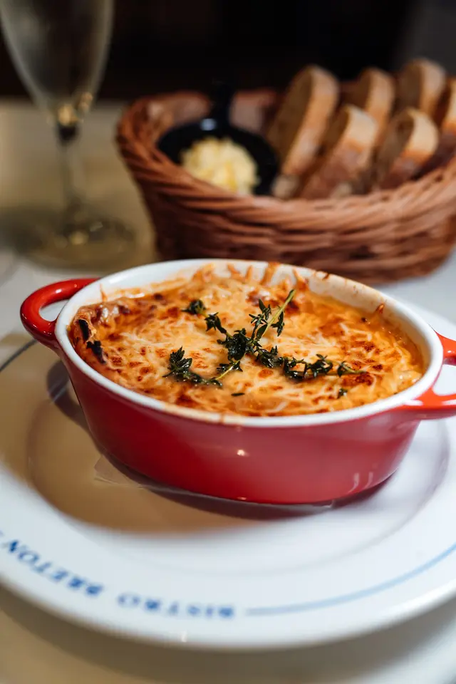 將洋蔥煲至軟腍,把其甜味迫晒出嚟,再加上濃厚嘅芝士🧀最底仲有浸淋咗嘅麵包🥖多重口感。