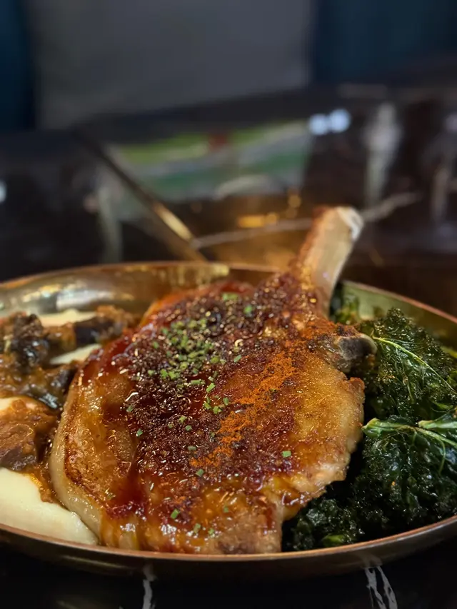 肉質超嫩滑,油脂分佈均勻,有榛子和橡果嘅獨特香氣,配上自家調配薑味橙醬汁,微辣帶橙香清新,令豬肉味道更有層次,配菜用上羽衣甘藍和薯蓉等,可平衡油膩感