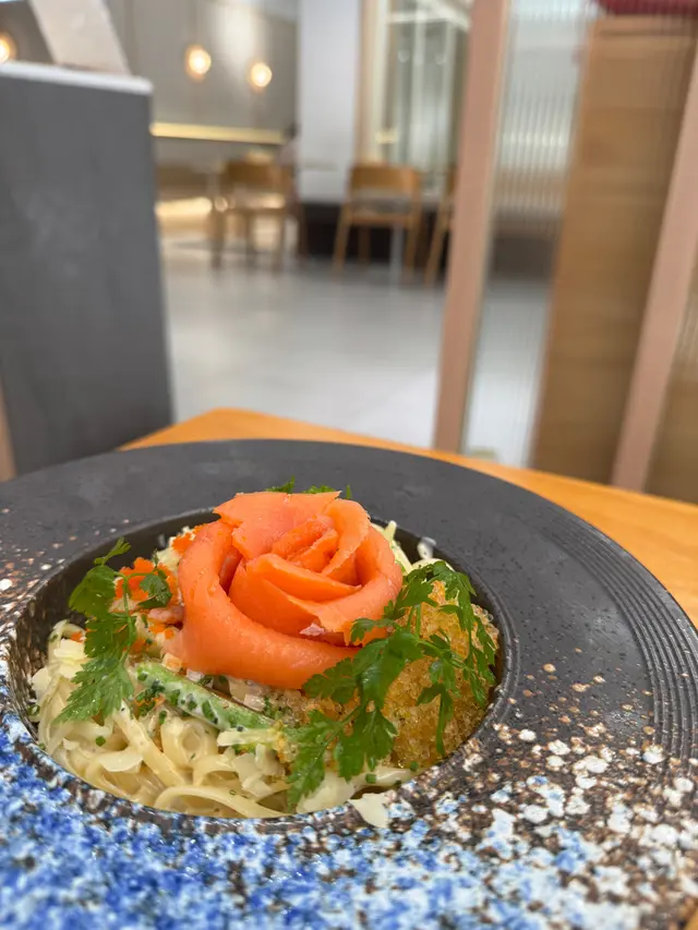 意粉以細扁的意大利為基底,搭配煙薰三文魚和蟹籽,淋上香濃的忌廉醬。蟹籽的鮮味與煙薰三文魚增添了整體的層次感,口感滑順。
