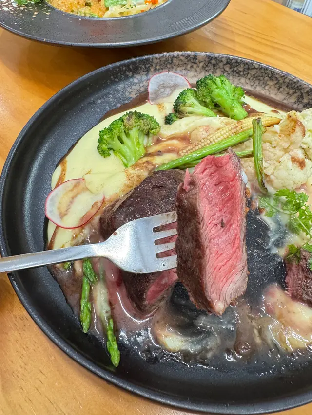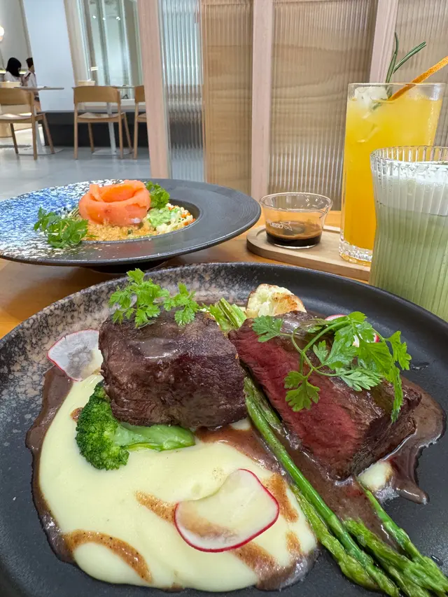 封煎的牛板腱肉質鮮嫩,外皮微脆。搭配新鮮的薯蓉和時蔬,並淋上香氣四溢的黑椒汁。