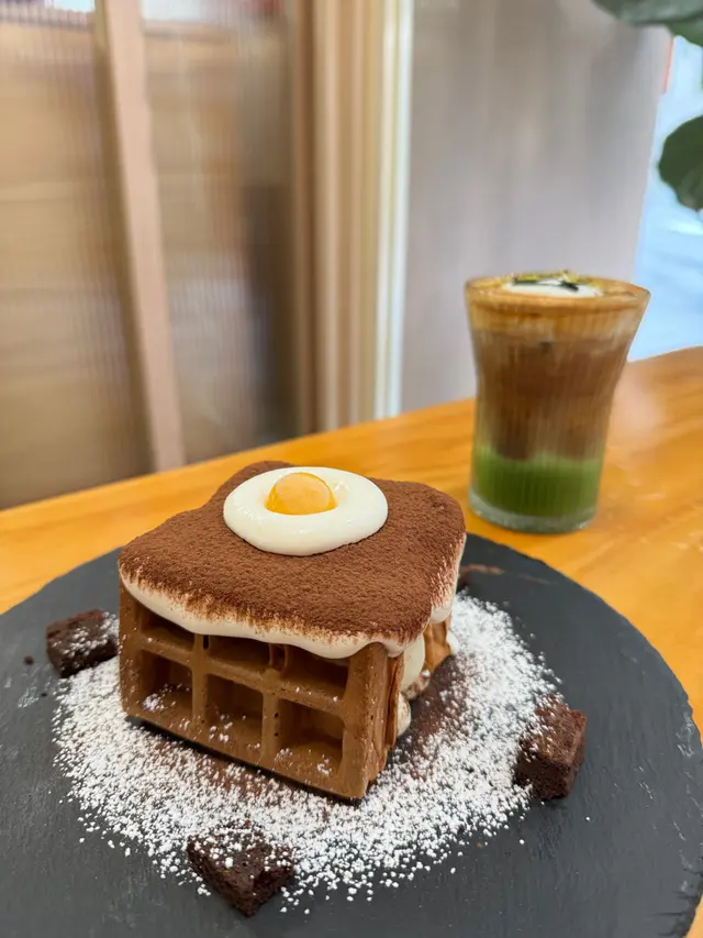 這道招牌窩夫外脆內軟,上面覆蓋著厚厚的芝士奶蓋,口感豐富。在窩夫中間鋪滿麻糬,幸福感滿滿。