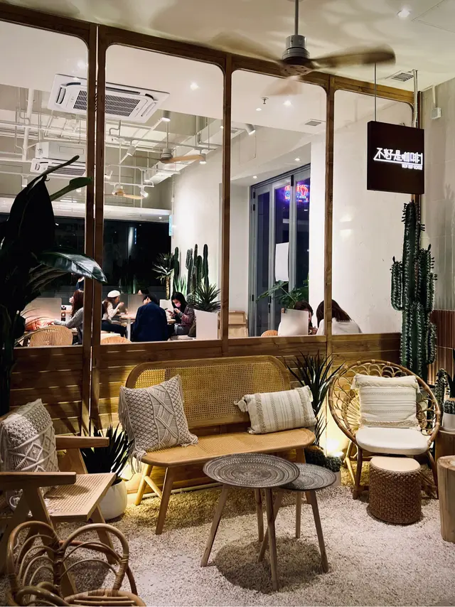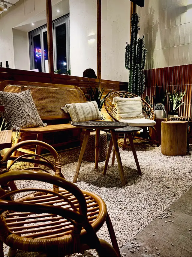 西營盤新店好近地鐵站,轉過彎就到。餐廳開係內街,夜晚感覺好寧靜。餐廳門口裝飾得比油麻地主店更靚,四處都係滕器同植物,滿滿嘅波希米亞風情,打卡一流。